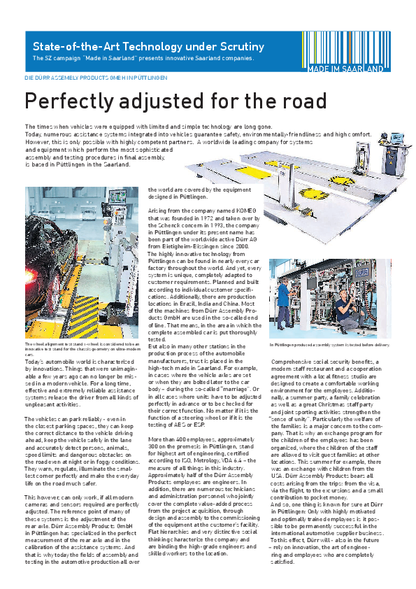 迪尔集团是世界领先的机械和设备工程公司之一,在自动化和数字化/工业4.0方面拥有广泛的专业知识。其产品、系统和服务能够在不同行业实现高效和节省资源的制造流程。迪尔集团供应汽车工业、机械工程、化工、制药、医疗技术和木工等行业。它在2020年创造了33.2亿欧元的销售额。该公司在33个国家拥有17000多名员工和121个营业点。自2021年2月以来,拥有多数股权的自动化专家Teamtechnik也加入了该集团。Dürr集团在市场上运营,旗下有Dürr、Schenck和HOMAG等品牌,并设有五个部门:
